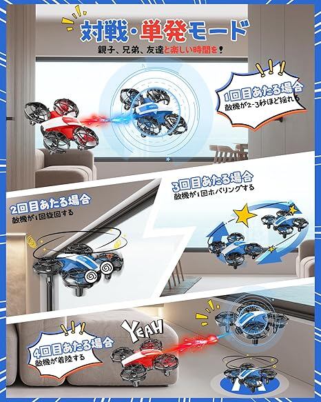 ・【対戦モード&2台セット】赤外線対戦機能を備えており、2台のドローンを同時に使用することで対戦ゲームを楽しむことができます。それに、2つの対戦モードがあります。単発モード:ボタンを1回押すと1回の赤外線が発射され、4回攻撃を受けるとドローンは着陸します。連発モード:ボタンを1回押すと5秒間で連続して10回の赤外線が自動的に発射されます。チャンスを掴んで素早く相手のドローンを倒しましょう!