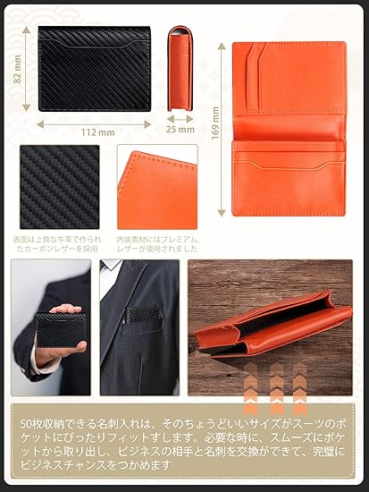 ・【メンテナン簡単】毎日使用の名刺入れですので、やはりメンテナン簡単が大切です。ビジネスマンにとって、簡単なメンテナンは時間の節約に役に立ちます。弊社の名刺入れはウェットティッシュでそっと拭いて、お手入れ完了できます。通勤中やお客様に会う前に、数秒拭いて、定期入れの清潔さが上司や同僚やお客様に成熟した感じを見せてくれますよ。