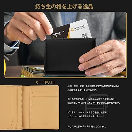 ・【規格】 [素材] 表地コードバン,裏地 牛本革 [重量] 約50g [本体サイズ] 約11cm*7.8cm*2.2cm [箱サイズ] 約13×11×3cm【大容量設計】メイン収納部は約70枚の名刺が収納可能。 ※名刺の厚さにより異なります。