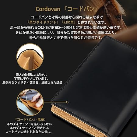・【コードバンの魅力】馬革*牛革・内側まで100%本革、革のダイヤモンドと評されるコードバンの魅力をあなたの元に。 丈夫な素材と耐久性に固定ファンも多い「コードバン」は、その質感と耐久性において、お財布や名刺入れの材質としてとても重宝されています。当店の使用するコードバン製品は材質から厳選して選ばれており、無駄のないすっきりとしたデザインで大変人気があります。ビジネスシーンにマッチする存在感は流石です。是非、コードバンの上質な名刺入れをあなたの仕事のパートナーに選んでください。内側のヌメ革も時間の経過と共に深みのある飴色に変化。 高品質の職人技に値するので、私たちの財布は、プレミアムトップレザーで作られています。使い続けるほど独特の味わいが生まれ「育てる愉しみ」があります