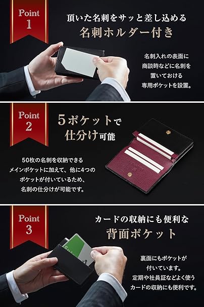 ・【最大50枚の名刺を収納可能】底の部分までしっかり広がる『通しマチ』を採用。収納力の高いことが特徴で、名刺交換の機会が多い方におすすめです。【5ポケットで仕分けも可能】50枚の名刺を収納できるメインポケットに加えて、他に4つのポケットが付いているため、名刺の仕分けが可能です。