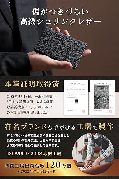 ・【傷がつきづらい高級シュリンクレザー】表面にシボ目が加工されているため耐久性が高く、傷が目立ちにくく、長期間きれいな状態を維持できます。【本革証明取得済】2023年9月13日、一般財団法人「日本皮革研究所」による厳正な品質検査にて、天然皮革である証明書を取得しました。【有名ブランドも手がける工場で製作】有名ブランドの革製品を手がける工場と契約し、品質の高い商品を製造。上質な革製品をお求めやすい価格で提供しております。※ISO9001・2008取得工場/年間工場出荷台数120万個(2022年の工場出荷台数)