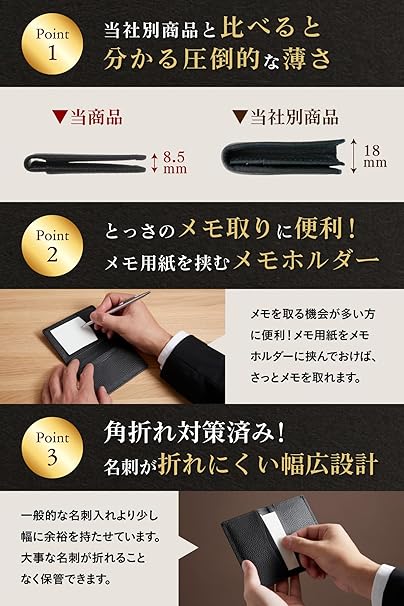 ・【とっさのメモ取りに便利!メモホルダー付き】名刺入れを開くと上部にメモホルダーが付いていて、メモ用紙を挟んでおけば、さっとメモを取ることができて便利。メモ帳代わりにもなるので、メモを取る機会が多い方にもおすすめです!
