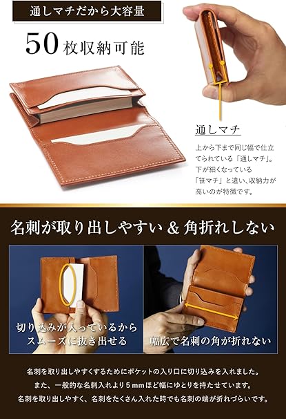 ・【通しマチだから大容量】上から下まで同じ幅で仕立てられている「通しマチ」。下が細くなっている「笹マチ」と違い、収納力が高いのが特徴です。薄型の名刺入れ(めいしいれ)ですが、一般的な厚みの名刺を50枚程度収納できます。