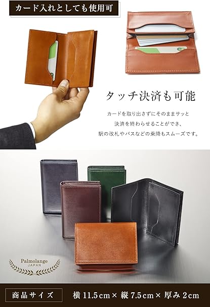 ・【商品詳細】◆素材:牛革(イタリアンレザー) ◆カラー:キャメル、ブラウン、ブラック、ネイビー、グリーン 風水で人気の緑色は天赦日、一粒万倍日、寅の日などの吉日と相性抜群でおすすめです。 ◆サイズ:横11.5cm×縦7.5cm×厚み2cm ◆ブランド名:Palmolange(パルモランジュ) ◆「一般財団法人 日本皮革研究所」による本革証明書を取得済み(令和5年2月14日 No.1246-1,2) ◆180日のメーカー保証が付いており、贈りものとして安心。環境配慮に対する取り組みで簡易包装にしていますので、プレゼントにはお相手の方に合わせたギフトボックス等をご用意していただけると幸いです。初期不良等の不具合がありましたら、保証規定に基づいてしっかり対応いたしますので、サポートまでご連絡ください。