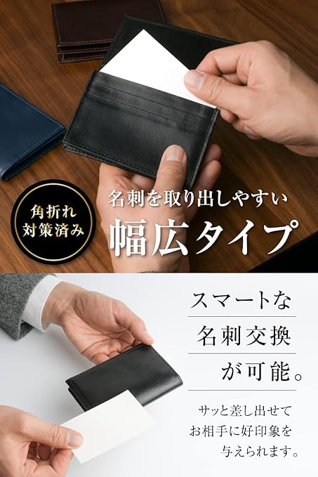 ・【名刺を取り出しやすい幅広タイプ】一般的な名刺入れより少し幅に余裕を持たせています。取り出しの際につっかえて名刺の角が折れてしまうことはありません。名刺交換の時に名刺を素早く差し出すことができ、お相手にスマートな印象を与えられます。