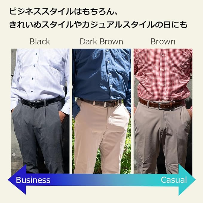 ・シンプルなデザインのベルトです。どんな服装にも合わせやすく、ビジネスシーンでもオフシーンでも使用可能です。