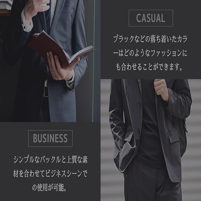 ・【様々なシーンに対応】シンプルで飽きないデザインと豊かなカラーバリエーションの紳士用 ベルト、紳士的な魅力を演出しながらどんなコーディネートにも合わせやすい。仕事、通勤、通学、ビジネス活動、ゴルフ、面接、デート、結婚式、卒業式、成人式、日常生活など色々な場合で活躍。