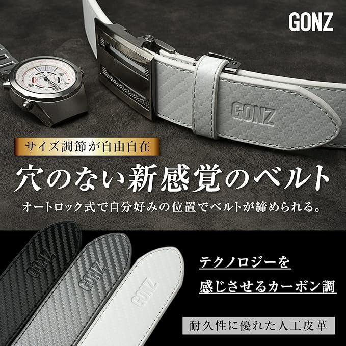・【商品詳細】◆ブランド名:GONZ ◆カラー:ホワイト、ブラック、グレー ◆素材:人工皮革 ◆サイズ:長さ/約140cm、幅/3.5cm ◆用途:ゴルフ、ビジネス、カジュアル ◆仕様:フィットバックル式(オートロックで無段階調節が可能)