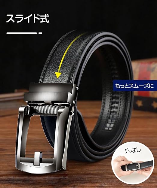 ・【穴なし・オートロックベルト】バックルにベルトを通すだけで好きな位置で留める事が出来る、穴なしスライド式ベルトです。服装の色とスタイルを選ばずに、スーツ、デニム、チノパンなどにも合わすことができますので フォーマル、カジュアルなどのシーンでご活用いただけます。