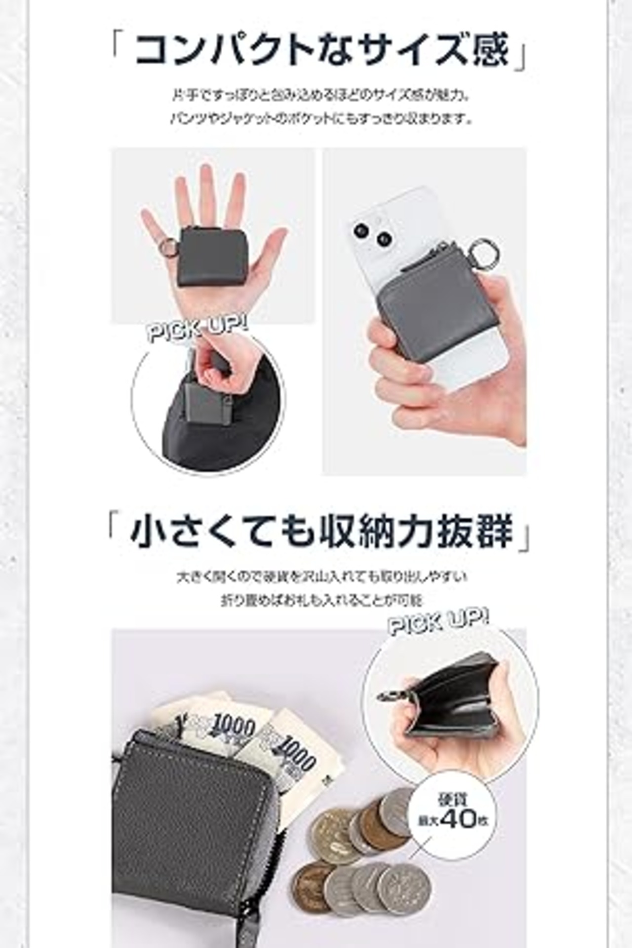 ・【コンパクトなサイズ感】片手ですっぽりと包み込めるほどのサイズ感が魅力。パンツやジャケットのポケットにもすっきり収まります。【小さくても収納力抜群】硬貨最大40枚大きく開くので小銭を沢山入れても取り出しやすい 折り畳めばお札も入れることが可能。マチ最大3.5cm。
