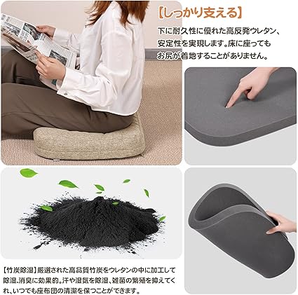 ・【竹炭除湿】厳選された高品質竹炭を下の高反発ウレタンの中に加工して除湿.消臭に効果的。汗や湿気を除湿、雑菌の繁殖を抑えてくれ、いつでも座布団の清潔を保つことができます
