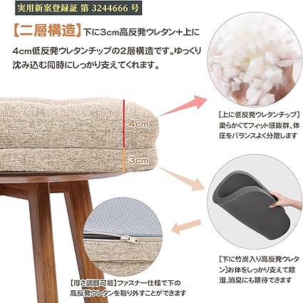 ・【二層構造】下に3cm高反発ウレタン+上に4cm低反発ウレタンチップの2層構造です(実用新案登録証−第324466号)。ゆっくり沈み込む同時にしっかり支えてくれます。体圧をバランスよく分散して柔らかな座り心地と安定性の実現した上に、お体の負担を大幅に軽減します