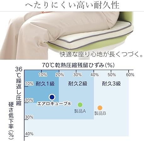 ・長時間座っても疲れにくいクッションです。エアロキューブの耐圧分散性により、長時間座っても疲れにくい仕様です。へたりにくく、通気性が良い上に、中材まで丸洗いができる便利なクッションです。オフィスやドライブなど、長時間座る方に。