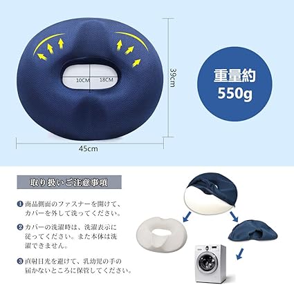 ・【最新型メモリーフォーム座布団】:サイズ:縦40X横45X厚さ5cm、本体材質:低反発メモリーフォーム、カバー:通気メッシュ素材、重量:550g。ご注意:クッションの表には少量の粘着防止パウダーがあり、気になる方はカバーを取り外してからパウダーを洗ってください。