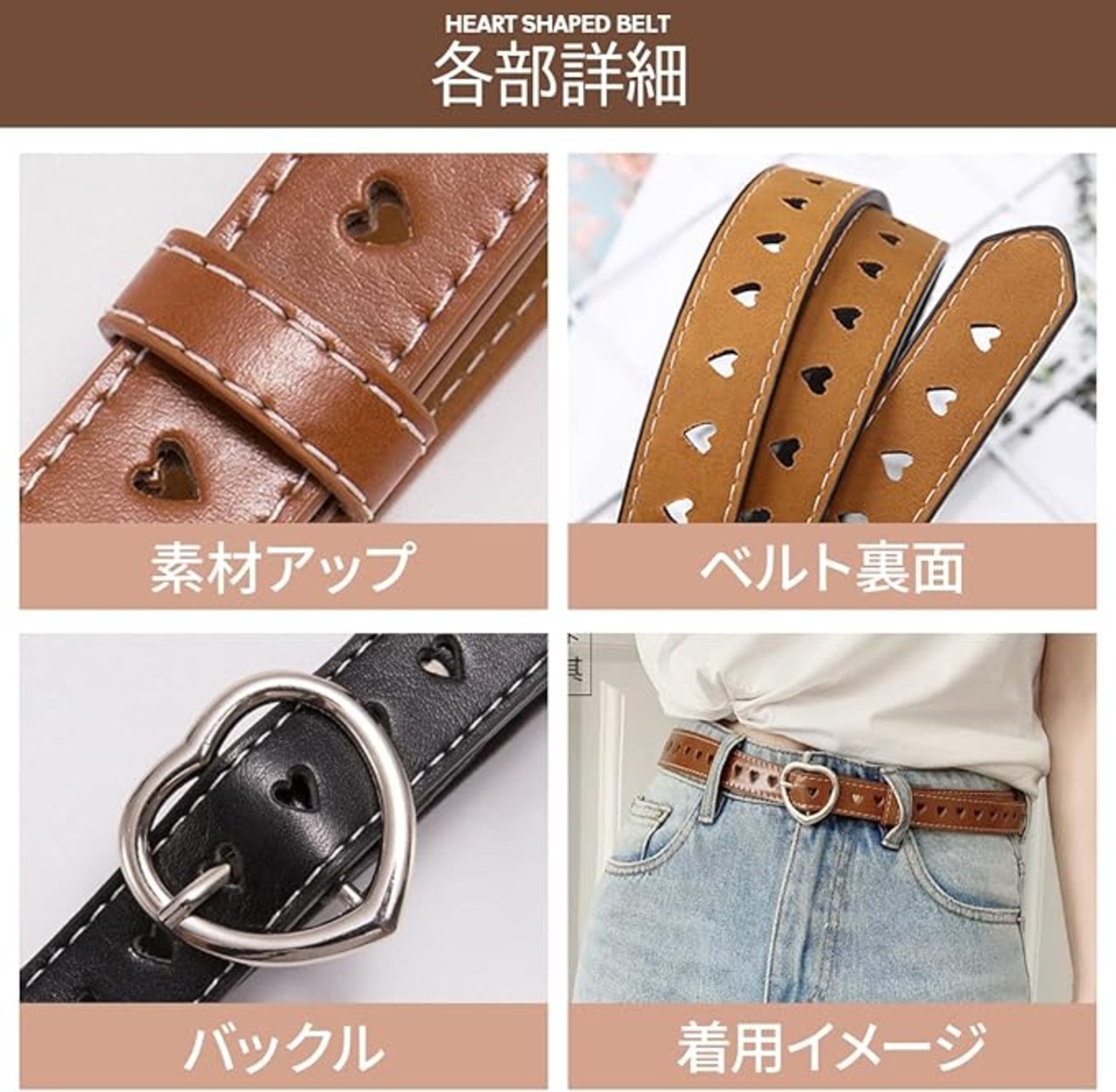 ・360°どこから見ても可愛いデザイン。ベルト穴は可愛いハート柄の模様。シンプルかつスタイリッシュなデザインベルトでパンツスタイルはもちろんワンピースやスカートの相性も良く、どんなシーンでも活躍できます。