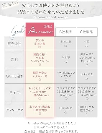 ・【大切な名刺をしっかりホールド】商談中に資料を広げた時などに移動させた名刺入れの上から「お相手の名刺が落ちてしまった!」というご経験はありませんか? Annekorの名刺入れは「名刺ホールドポケット」がついており、お相手の大切な名刺を落とすことなく、商談に集中していただけます。 サイズは日本の名刺の大きさに合わせてサッとポケットに入る様に設計【横108mm×縦74mm×14mm、重さ50g】です。