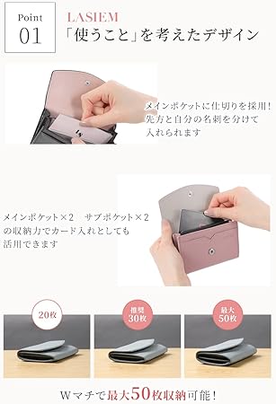 ・【「使うこと」を考えたデザイン】名刺を分けて入れられる仕切り。サラサラして取出しやすい内面素材。Wマチの大容量設計など、実用的な機能を備えています。