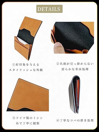 ・【 タイプ 】名刺入れ 【 素材 】タンニンなめし 本革 【 サイズ 】横幅11cm×縦幅8cm×厚み1cm 重さ45g 【 仕様 】メインポケットx1 サブポケットx2 【 収納枚数 】名刺 40枚程度