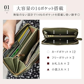 ・【 2箇所あるお札入れ/マルチ収納可能なフリーポケット 】お札入れは2箇所に分かれているので、お好みで仕分けが可能。大きく開き見やすいのも◎使い方いろいろなフリーポケットは、こちらも2箇所ありレシート・領収書・切符・チケット等マルチ収納ができる便利な収納です。