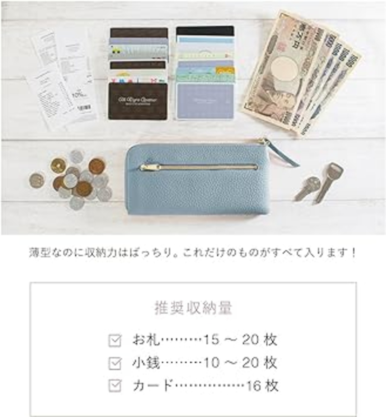 ・【見た目以上の大容量】16枚分のカードポケットに、フリーポケットやファスナーポケットが付属。絶妙な高さに計算されたファスナーレスの小銭入れ。整理が簡単で、目当てのものが見つけやすい構造です。L字ファスナーを開くだけで硬貨・お札・カードにアクセスできるので、お会計もスムーズに。