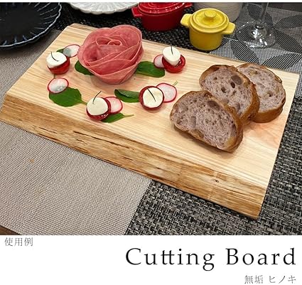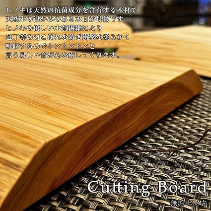 ・ヒノキは天然の抗菌成分を含有する木材で天然木の温かみのある木目が特徴です。 ヒノキの優しい木質繊維により包丁等の刃こぼれを防ぎ衝撃を柔らかく