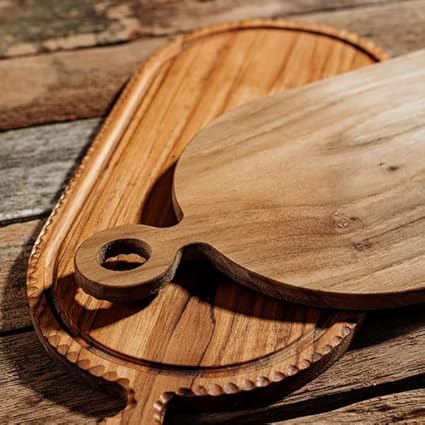 リム(ふち)部分の彫りがおしゃれなチーク材のカッティングボード