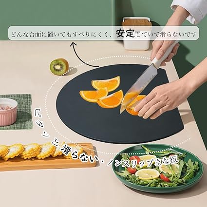 ・【耐熱エラストマー まな板・丸いまな板】傷もつきにくく水はけのよい素材 100%熱可塑性エラストマーを採用!木製のまな板のようなやわらかな刃あたりで、食材がすべりにくく刃がしっかりと入り込むので、お肉やお魚、カボチャなどの硬い食材もしっかり楽に切ることができます。切った食材を移動させながら効率良く作業ができ、切った食材をまな板の上に置いたまま他の食材をカットすることもできます。面積が広い丸形だから、カットした食材を並べて置いてお皿いらず!