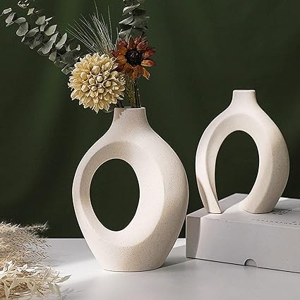 ・ユニークな中空の円形:このセラミック花瓶の家具用品の中央部分はくり抜かれており、非常にユニークで芸術的で、花瓶だけでなく芸術作品にもなっています。この花瓶は本棚、ダイニングテーブル、テレビキャビネットなどに置くことができます。