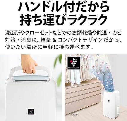 気になる部屋干し衣類の臭いを抑制。部屋干し衣類のイヤな臭いを抑制。部屋干し衣類のイヤな臭いを抑制しながら、しっかり衣類を乾燥します。プラズマクラスター除湿機の効果:付着生乾き臭付着汗臭タバコの付着臭バスマットに付着した菌付着カビ菌ピンクぬめり原因菌。洗いにくい衣類も手軽に消臭。シャープ独自の空気洗浄技術、プラズマクラスター7000を搭載しています。省エネ除湿&コンパクトサイズ。コンプレッサー方式の運転メカニズム:室内の湿った空気を冷却器で冷やし、結露させることで除湿。結露しやすい暑い季節に省エネで高い能力を発揮します。定格除湿能力7.1L/日。1時間あたりの電気代約5.1円。衣類乾燥時間(約2kgの洗濯物)約180分。省スペースほぼA4サイズの設置面積で狭いスペースでもお使いいただけます。バスマットに付着した菌の増殖を抑制。床まで届く下吹き送風。ハンドル付で持ち運びラクラク。洗面所やクローゼットなどでの衣類乾燥や除湿・カビ対策・消臭に。軽量&コンパクトデザインだから、使いたい場所に手軽に持ち運べます。運びやすいハンドル。使いやすさにこだわった充実機能。凹凸が少なくお手入れしやすい[ハンドル付きタンク]大きなホコリを入り口でブロックする[ホコリブロックプレフィルター]本体の内部に残った水分を乾燥(衣類消臭「弱」運転を2時間切タイマー設定で運転して頂くことで内部を乾燥します。)24時間連続排水に対応。本体にホースをつなげば、連続排水が可能に。排水タンクに溜まった水を捨てに行く手間が省けたり、外出中などの長時間運転にも応えます。
