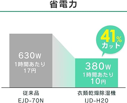 ・デカント式なのに省エネ!:必要最低限の除湿量に抑える事で省エネに。従来品と比較しても電気代が約20%カットされています!300W/1時間あたり約8.1円