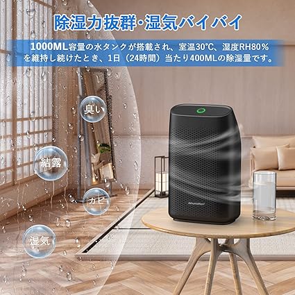 ・【強力除湿・梅雨対策】この除湿機は、ペルチェ式チップを採用し、空気中の水分を素早く凝縮し、乾燥された空気を排出させます。ダニ、結露、異臭、カビなど、湿気による問題を効果的に防ぎ、快適で乾燥した空間を提供します!1日中最大450ml(34oz、温度:30℃、80%RHの環境にテスト結果)の湿気を迅速と効果的に除去できます。除湿機は1000ml大容量の水タンクが搭載され、頻繫的な排水が必要なし。ジメジメした季節でも、爽やかな気分で過ごせます!