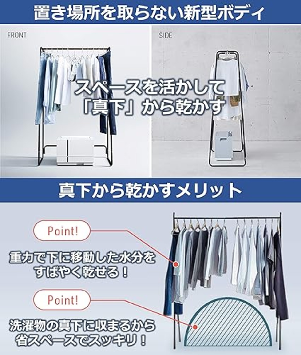 ・洗濯物の真下に置ける省スペース設計。低背&下から送風スタイル