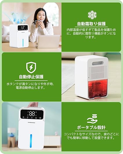 ・【小型軽量&お手入れ簡単】わずか1.07kgの重さで軽量小型除湿機。24.2x15x13.8cmのコンパクト式除湿器で持ち運びに非常に便利し、子供やお年寄りの人でも、片手で気軽に持ち運べる。ハンドル付きなので部屋から部屋まで自由に移動できます。ご購入した日より一年間保証サービスをご提供いたします。万が一初期不良が発生した場合、連絡先:アカウントサービス内の「注文履歴」→「出品者に連絡」或いは説明書に記載されている他の連絡先から、お気軽にお問合せ下さい。