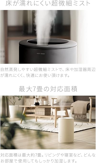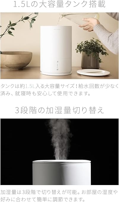 ・仕様・スペック | サイズ:横幅17.6×奥行き17.6×高さ27.2cm / コード長:約1.5m / 重量:約1.3㎏ / 材質…ポリプロピレン / 定格電圧:AC100V / 定格周波数:50/60Hz / タンク容量…1.5L / 連続加湿時間…19時間 / 適用床面積:和室4畳、洋室7畳 / 付属品:取扱説明書・掃除用ブラシ