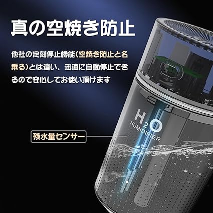 ・【真の空焼き防止機能】 市販の多くの小型加湿器が空焼き防止と名乗りますが、実は定刻停止機能(4時間運転後自動停止)です。 水が残っても時間になると勝手に運転停止になるストレス、再起動すると水がなくなっても何時間空焼き運転する不安はあるでしょう。 それに対して、KMJの小型加湿器は水量センサーを搭載し、水がなくなったら直ちに運転を自動停止する仕様なので、子供のいるご家庭や寝室用/車用の場合にも安心してお使いいただけます。 本当の意味の空焼き防止機能のおかげで、電子部品への損傷が少なく製品の耐久性も高くなります。
