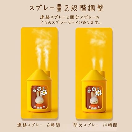 【給水タンク】 ・給水しやすい上部給水式 ・残量が簡単にチェックできる透明タンク ・大容量450ml 【USB給電】 ・パソコンやモバイルバッテリーからも給電可能です 【静音設計】 ・20~30dbと静かな動作音です 【2段階調整スプレー】 ・連続スプレー(6時間稼働)と、間欠スプレー(10時間稼働)の切り替え可能です 【4パターンのミッフィー】 ・本体を回転させることで、お気に入りのミッフィーが選べます 商品名:ミッフィーえんとつのお家加湿器 カラー:ピンク、イエロー、ブルー 加湿エリア:8平方メートル スプレー量:40ml/h *モニター発色により色合いが異なる場合やサイズに多少の誤差がございますが、 ご了承ください。