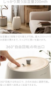 ・ しっかり潤う加湿量 | 加湿量は2段階で切り替えが可能で、最大200ml/h。お部屋の隅々までたっぷりと潤いを届けます。加湿器の吹き出し口が360°回転する仕様になっているので、狙った方向に効率よく加湿が可能です。コンパクト設計ながら最大6畳の対応面積で、リビングや寝室など、どんなお部屋で使用してもしっかり加湿します。タンクもたっぷり入る1.6Lで最大11時間連続運転が可能です。就寝時でも安心してお使い頂けます。