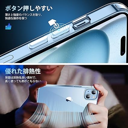 ・【高級感漂う・透明感抜群】 99.99%に持ち上げた透明感がiphone15の美しさをそのまま。厳選した高透明度、更に耐黄変に強い特殊なポリカーボネート素材を採用、指紋がつきにくい・黄ばんでなく正真正銘のクリア!本来の崇高な美しさと高級感を損なわなく、いつものスマホに上品さをプラス。