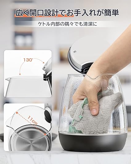 ・【使いやすさと清潔さ】他社の電気ケトルと比較して、フタは150°まで開き、広口設計でケトル内部まで簡単に手入れができます。ワンタッチスイッチ式の電源開閉とフタ操作で、軽量な660gの本体は片手で操作可能です。持ち運びも簡単です。