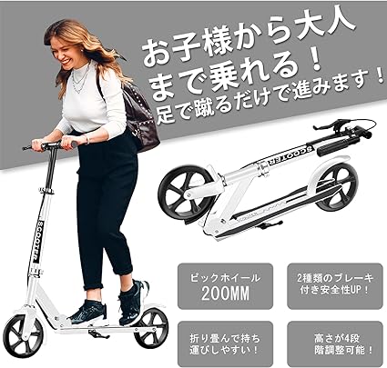 ・【2種類ブレーキ】フロントブレーキとリアのフットブレーキで高い制動機能を実現。とっさのブレーキにもしっかり対応。軽い力でもしっかりとブレーキを効かせる。雨天などの悪天候時でもブレーキ性能が落ちにくいキックボードです。大人の方も安心して乗って頂ける丈夫な作りで耐荷重は200kg。