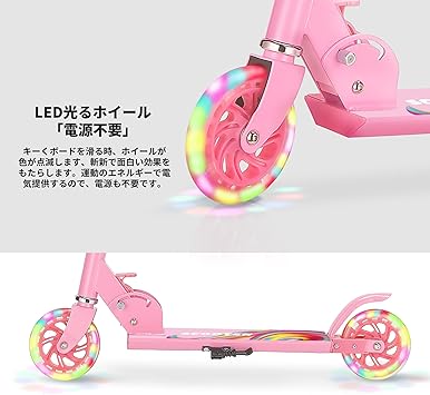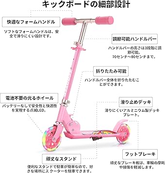 商品仕様: ホイール数:2、適合年齢:3歳から12歳、ハンドル高さ:70cm/75cm/80cm調節可能、折畳サイズ:20.5*60.5cm。 商品詳細: 本製品は子供用キックボードで、破損しにくい素材で、上質なデザインを加え、お子様が楽しく遊べ、親様も安心できるキックスクーターです。 フォームイージーグリップハンドルバー、高さ調節可能、折りたたみ簡単、軽量、キャンディー柄のフロストデッキが整えた子供向きキックボードです。 ヤスリのようにザラザラしていて、足全体が入るほど広いつや消しデッキが特徴で、滑りにくく、高速走行時でも最高の安定性を維持し、最大限の安全性を実現できます。ハンドルブレーキ付きで、フットブレーキも付きで、片手や片足でキックボードを停止でき、より安全に乗ることができます。