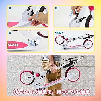 ・【高質の素材・3段階調節】丈夫で錆びにくいアルミ合金製で、軽量かつ頑丈なボディのペダルスクーターです。身長110cm以上のお子様から大人まで使用でき、88cm、95cm、102cmの3段階に調節可能で、耐荷重100kgで、背の高い方にも小さい方にも適しています。