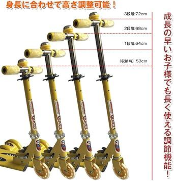 ・【商品内容】光るキックスケーター ad098【サイズ】高さ(3段階調節):約64cm/約68cm/約72cm・ハンドル幅:約25cm・ボード幅:約10cm・本体長さ:約59cm・タイヤ径:約9cm【カラー】ブルー/ブラック/イエロー/ピンク【重量】約1.9kg【耐荷重】約60kg【対象年齢】6歳以上※商品の使用には問題がない程度で、ネジの締まり方により車輪の回り具合が異なる場合がございます※公道を走ることは法律で罰せられますのでおやめください。※海外輸入商品により、汚れ/ダメージ等がついている場合がございます。※仕様は改善の為に予告なく変更する場合があります。