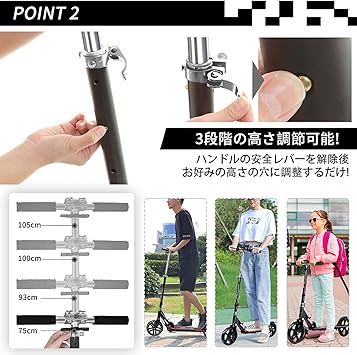 ・【3段階調節可能】キックボードの高さは身長に合わせて3段階(75、93、100、105cm)の調節が可能で、子供から大人まで幅広い年齢層に適用しています。人間工学に基づいて、ソフト素材の製造と厚いゴムで、ハンドルはより快適に握りやすいです。自分用はもちろん、プレゼントとしても最適です。