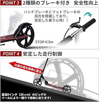 ・【高品質&安全性UP】2021新モデルの立ち乗り式キックボードは、ハンドブレーキとフットブレーキの両方を備えており、どちらも後輪にブレーキをかけることができます。アルミニウム製の軽量スクーターは滑り止めのデッキと大幅のデザインで、安心に快適な走りを体感し、何年にわたっても使用に耐えます。