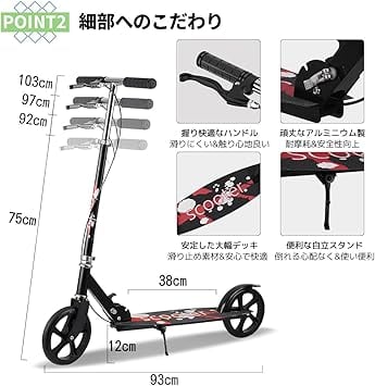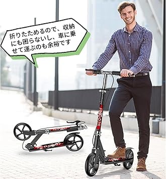 ・【折り畳み式キックボード&ワンタッチで簡単コンパクト】折りたたむことによってキックボード自体がコンパクトになるので、お部屋で保管できるので盗難の心配はなし。持ち運びはやすく、電車やバスに持ち込め、駐輪場などを気にしなく、通勤、通学、買い物などにおすすめします。女性でも楽々持ち運び 。自立可能な折りたたみ式スタンドを装備し、どこにでも立てられる。置き場に困りません。