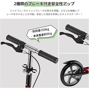 ・【2種類ブレーキ】フロントブレーキとリアのフットブレーキで高い制動機能を実現。とっさのブレーキにもしっかり対応。軽い力でもしっかりとブレーキを効かせる。雨天などの悪天候時でもブレーキ性能が落ちにくいキックボードです。大人の方も安心して乗って頂ける丈夫な作りで耐荷重は150kg。