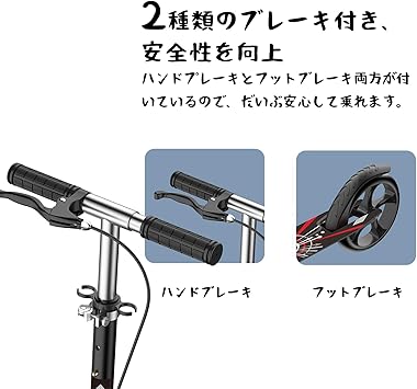 ・【2種類ブレーキ】フロントブレーキとリアのフットブレーキで高い制動機能を実現。とっさのブレーキにもしっかり対応。軽い力でもしっかりとブレーキを効かせる。雨天などの悪天候時でもブレーキ性能が落ちにくいキックボードです。大人の方も安心して乗って頂ける丈夫な作りで耐荷重は150kg。