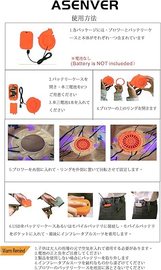 ・使用手順:着用後、足と腰のバックルをロックしてから膨らませる必要があります。 バッテリーをバッテリーケースに取り付け、バッテリーケースのスイッチを入れます。数分後、製品には空気が満杯になります。 (USBでモバイルバッテリ充電がご利用いただけます)